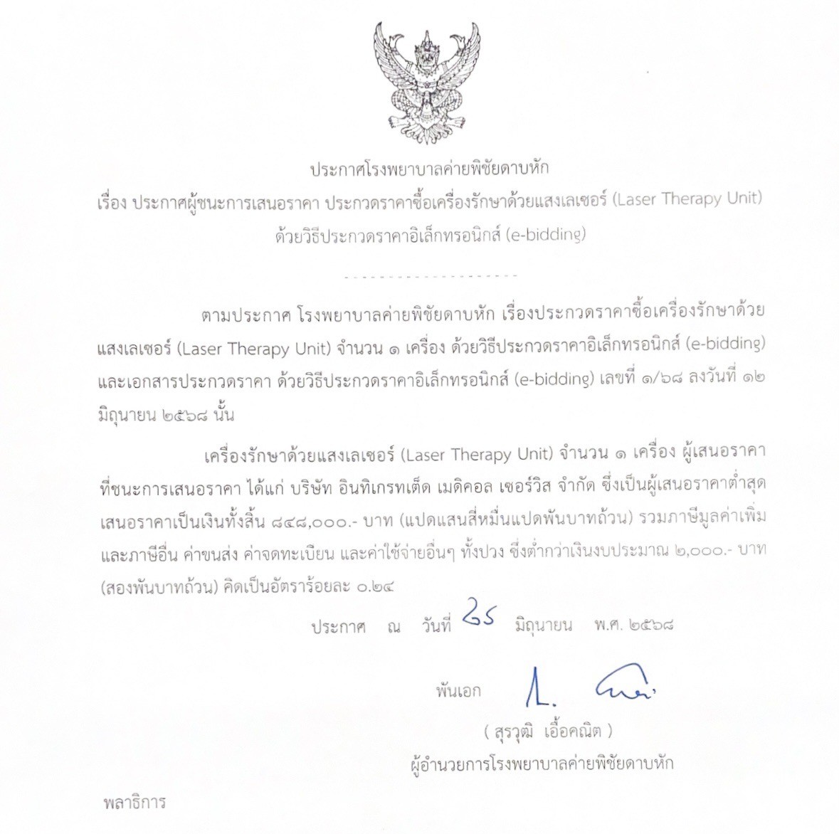 ประกาศผู้ชนะการเสนอราคา ประกวดราคาซื้อเครื่องรักษาด้วยแสงเลเซอร์ (Laser Therapy Unit) ด้วยวิธีประกวดราคาอิเล็กทรอนิกส์ (e-bidding)