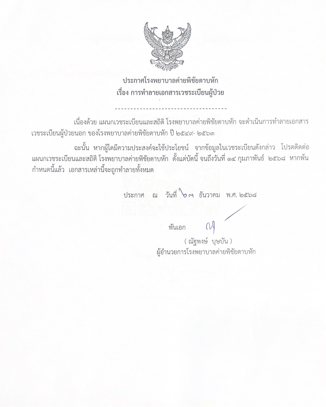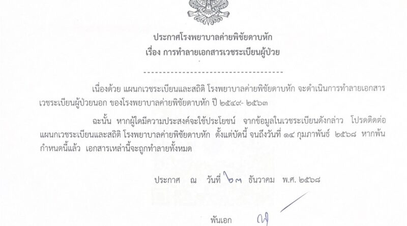 ข่าวประชาสัมพันธ์ ประกาศโรงพยาบาลค่ายพิชัยดาบหัก เรื่องการทำลายเอกสารเวชระเบียนผู้ป่วย 05/01/202606/01/2026 Admin01 ประกาศโรงพยาบาลค่ายพิชัยดาบหัก เรื่องการทำลายเอกสารเวชระเบียนผู้ป่วย >>> สามารถตรวจสอบรายชื่อเอกสารเวชระเบียนผู้ป่วยได้โดยสแกน QR Code ที่ปรากฏด้านล่างนี้
