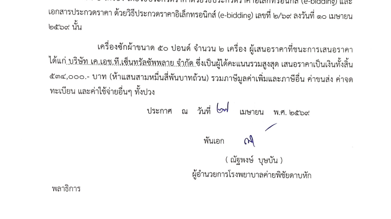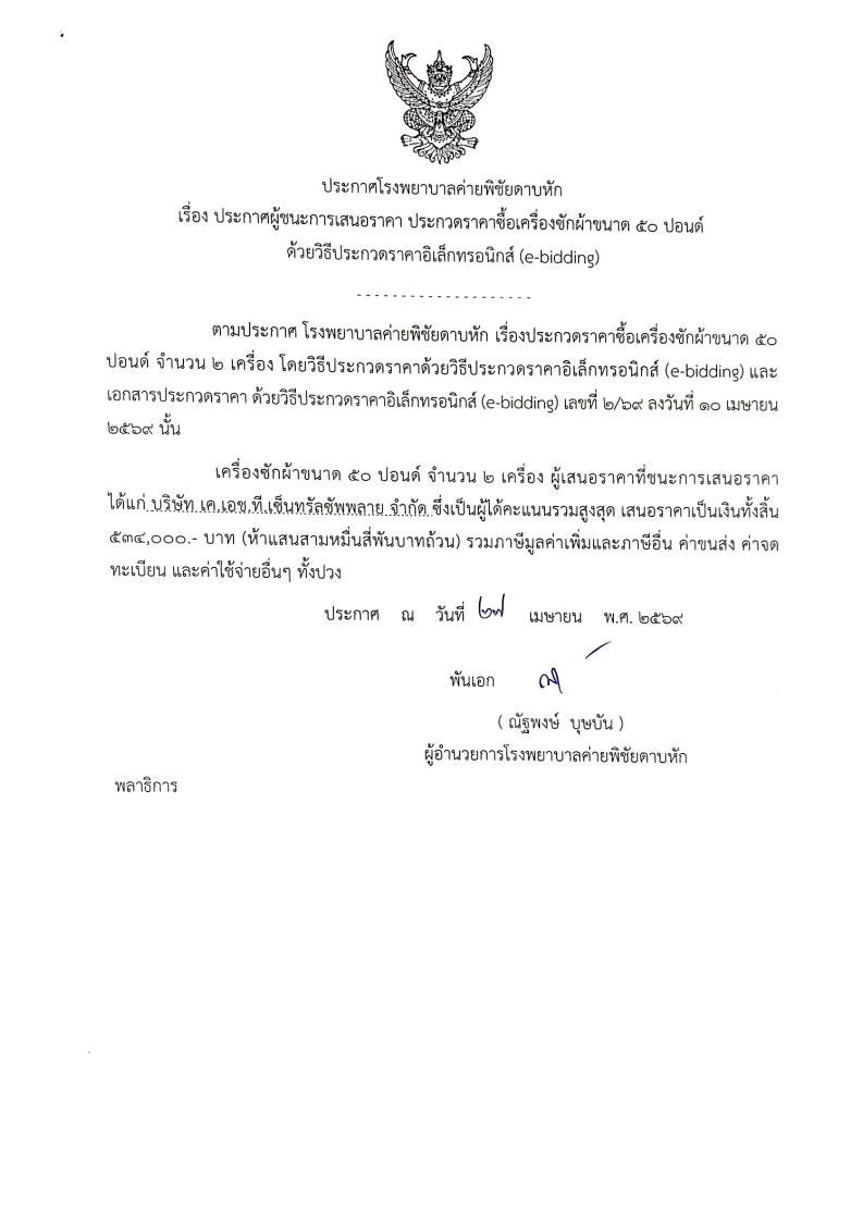 ประกาศผู้ชนะการเสนอราคาประกวดราคาซื้อเครื่องซักผ้าขนาด 50 ปอนด์
